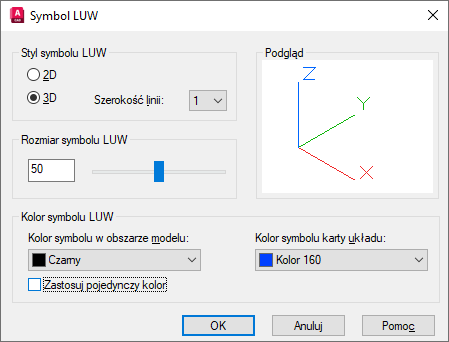 Steruje szerokością linii ikony układu LUW, jeżeli została wybrana ikona 3D układu LUW.