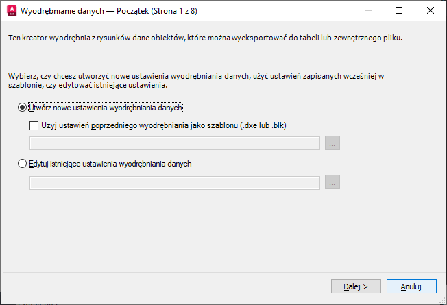 Tworzy nowe ustawienia wyodrębniania danych i zapisuje je w pliku DXE. Można również określić poprzedni plik wyodrębniania (DXE lub BLK), aby użyć go jako szablonu.