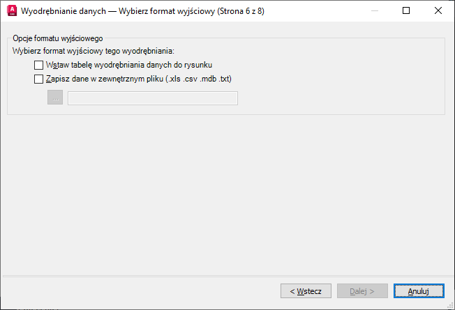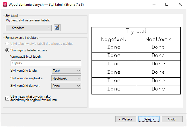 Steruje wyglądem tabeli wyodrębniania danych. Ta strona jest wyświetlana tylko wtedy, gdy na stronie Wybierz format wyjściowy wybrana jest tabela AutoCAD.