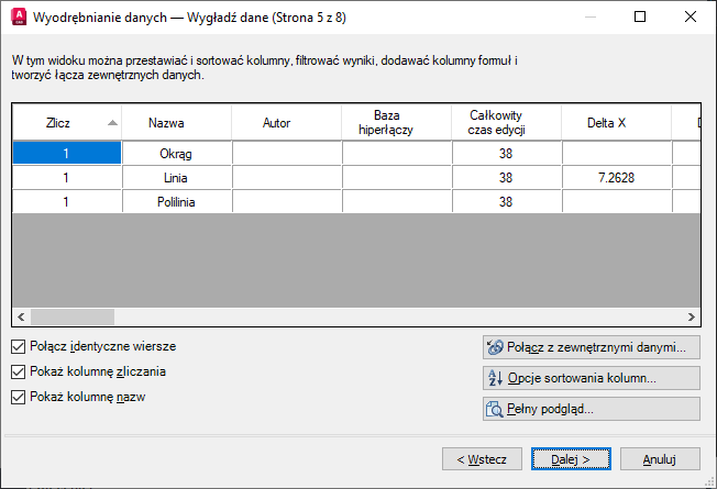 Te informacje są używane do utworzenia tabeli wyodrębniania danych w bieżącym rysunku lub zapisywane w zewnętrznym pliku.