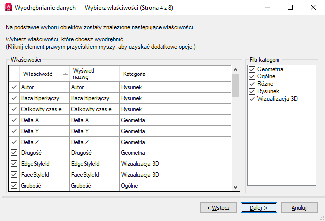 Wyświetla listę kategorii wyodrębnionych z listy właściwości. Niezaznaczone kategorie powodują filtrowanie listy właściwości. Kategorie to Wizualizacja 3D, Atrybut, Rysunek, Blok dynamiczny, Ogólne, Geometria, Różne, Wzór, Tabela i Tekst.