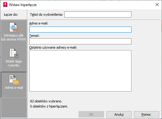 Tworzy listę ostatnio używanych adresów poczty elektronicznej, z których można wybrać jeden dla hiperłącza.