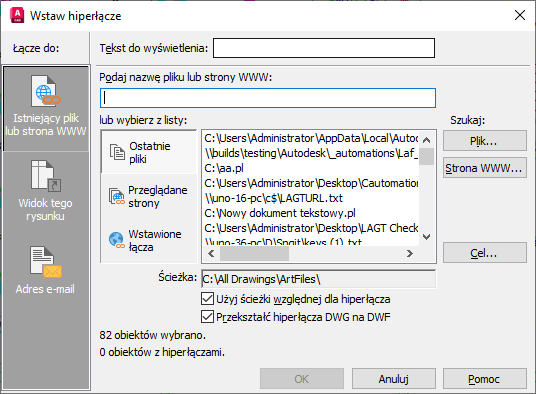 Wyświetla ścieżkę do pliku skojarzonego z hiperłączem. Jeśli wybrano opcję Użyj ścieżki względnej dla hiperłącza, na liście pojawia się tylko nazwa pliku. Jeżeli nie wybrano opcji Użyj ścieżki względnej dla hiperłącza, wyświetlana jest pełna ścieżka oraz nazwa pliku.