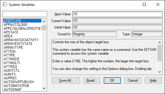 | Initial Value | Wyświetla początkową wartość zmiennej systemowej podświetlonej w polu w listy. Jest to wartość zmiennej systemowej w nowym rysunku. |