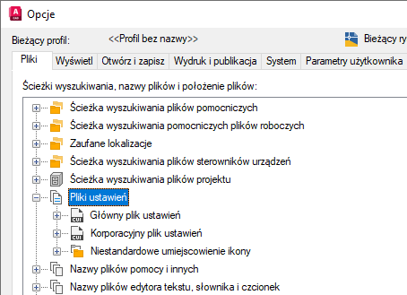 - W oknie dialogowym Opcje, na karcie Pliki kliknij znak plus (+) obok pola Pliki ustawień, aby rozwinąć listę.