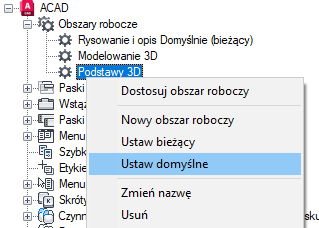 Obszary robocze w pliku CUIx mogą być oznaczane jako domyślne. Ustawienie obszaru roboczego jako domyślnego określa, że ma on zostać przywrócony podczas wczytywania pliku CUIx do programu po raz pierwszy lub po wczytaniu pliku CUIx za pomocą polecenia WCZYTAJCUI.