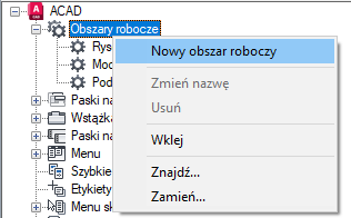 Na karcie Dostosuj, w panelu Dostosowywane pliki: <nazwa pliku> kliknij prawym przyciskiem węzeł Obszary robocze, a następnie kliknij opcję Nowy obszar roboczy.