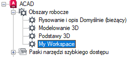 Na karcie Dostosuj, na panelu Dostosowywane pliki: <nazwa pliku> kliknij znak plusa (+) obok węzła Obszary robocze, aby go rozwinąć.