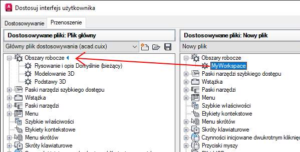 W panelu Dostosowywania w <nazwa pliku> (po prawej stronie) przeciągnij obszar roboczy z pliku CUIx do węzła Obszary robocze w głównym pliku CUIx w panelu Dostosowywania w <nazwa pliku> (po lewej stronie).