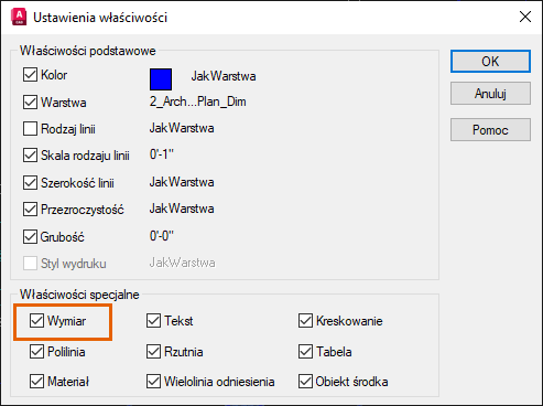Właściwości specjalne umożliwiają zastosowanie właściwości specyficznych dla typu obiektu źródłowego. W przypadku obiektów wymiarów jest to styl wymiarowania i inne.