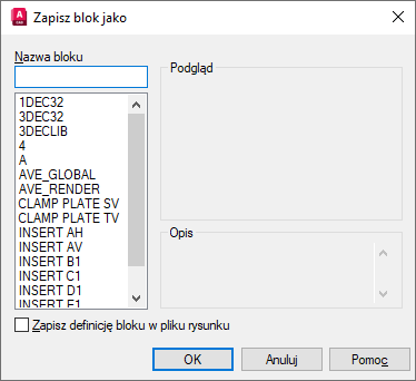 Zapisuje definicję bloku jako plik rysunku. Wybranie istniejącego pliku rysunku spowoduje nadpisanie zapisanego pliku. Określona nazwa bloku jest domyślnie uznawana za nazwę pliku rysunku.