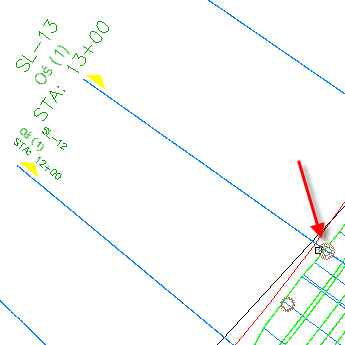 Tylko jeden z bloków został zrzutowany na widok przekroju. Obiekty w obszarze można rzutować na widok przekroju tylko wówczas, gdy obiekt mieści się w szerokości prostopadłego pasma przy określonej linii próbkowania. Blok przy linii SL-3 nie został zrzutowany na widok przekroju, ponieważ wartość odsunięcia bloku jest większa niż prostopadłe pasmo objęte linią SL-13. Czarne, przerywane linie na poniższym rysunku ilustrują zakres linii próbkowania przy linii SL-13.