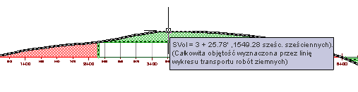 Zauważmy, że jest to miejsce w pobliżu punktu, w którym objętość transportowana na odkład (czerwona) i objętość transportowana na miejscu (zielona) stykają się z linią wykresu transportu robót ziemnych. Sprawdzenie tej pikiety na profilu pozwoli stwierdzić, że jest to względnie płaski fragment istniejącej powierzchni terenu. Płaski obszar jest dobrą lokalizacją na usypisko i urobisko.