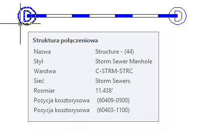 Na etykiecie narzędzi wyświetlane są opis i identyfikator pozycji kosztorysowych przypisanych do tego wpustu ulicznego.