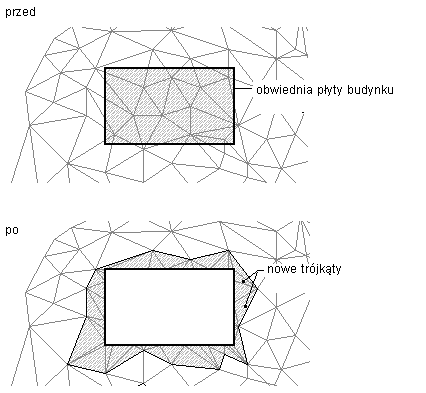 Po usunięciu krawędzi następuje utworzenie granicy wewnętrznej biegnącej po sąsiednich liniach lub modyfikacja granicy zewnętrznej polegająca na jej poprowadzeniu po nowych liniach.