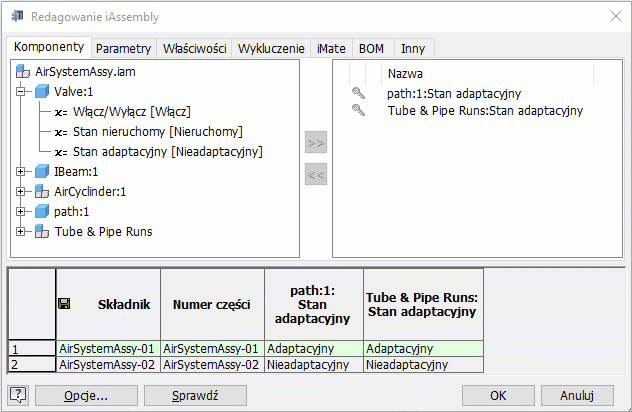 zbiór możliwych wymian przewodów rurowych w tabeli konfiguracji, używając polecenia Ustaw adaptacyjność. Jeśli polecenie Ustaw adaptacyjność nie zostanie zastosowane, główny zespół przebiegów będzie się zachowywał jak zwykły komponent programu Inventor, nie będzie konfigurowalny i będzie współdzielony w generatorze iAssembly. W takim wypadku główny zespół przebiegów może być adaptacyjny tylko w jednym elemencie iAssembly, inaczej pozostanie nieadaptacyjny w całym generatorze iAssembly przewodów rurowych.