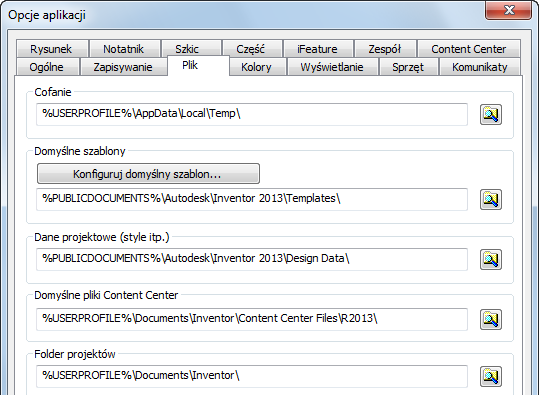 Domyślnie szablony programu Inventor dostarczane wraz z programem Autodesk Inventor znajdują się w folderze C:\Program Files\Autodesk\Inventor <wersja>\Templates lub C:\Users\Public\Documents\Autodesk\Inventor <wersja>\Templates. Położenie szablonów można znaleźć w oknie Opcje aplikacji na karcie Plik. W przypadku pracy w środowisku sieciowym folder ten znajduje się w lokalizacji udostępnionej, a nie na lokalnym dysku twardym. Jeśli brak jest pewności co do położenia, należy skontaktować się z administratorem IT lub CAD.