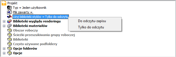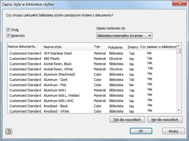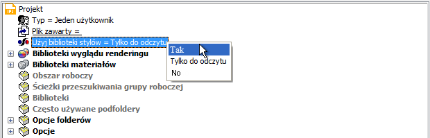 W programie Inventor 2012 opcja Użyj biblioteki stylów = Nie została usunięta z ustawień pliku projektu. Począwszy od programu Inventor 2012, jeśli styl jest zgodny ze stylem w bibliotece stylów, wszystkie style są automatycznie usuwane z dokumentów programu Inventor. Jeśli w starszej wersji zdefiniowano niestandardowy styl na podstawie szablonów niestandardowych, a biblioteki stylów, ustaw opcję Użyj biblioteki stylów = Tak lub Do odczytu-zapisu, jak pokazano na poniższych ilustracjach. Ta operacja spowoduje zapisanie niestandardowego stylu szablonu niestandardowego w bibliotece stylów w nowej wersji programu Inventor.