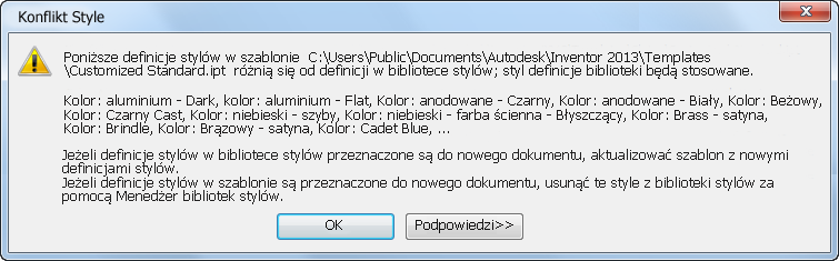 Aby uniknąć tego ostrzeżenia, zapoznaj się z tematem Komunikat Konflikt stylów zamieszczonym na blogu działu pomocy technicznej programu Inventor pod adresem Being Inventive.