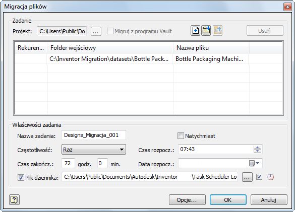 Harmonogram zadań tworzy plik dziennika — tu zapisywane jest, które pliki zostały pomyślnie przeniesione, a które nie. Jest to plik w formacie ASCII (.txt) i domyślnie znajduje się w folderze C:\My Documents\Inventor <wersja>\Task Scheduler\Log & Report Files lub C:\Users\Public\Documents\Autodesk\Inventor <wersja>\Task Scheduler Logs & Reports.