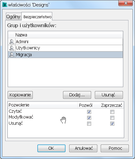 Jeśli firma korzysta z zabezpieczeń na poziomie folderów programu Vault, to należy przyznać użytkownikowi Migracja uprawnienia dostępu do wszystkich folderów wraz z uprawnieniami do odczytu i modyfikacji.