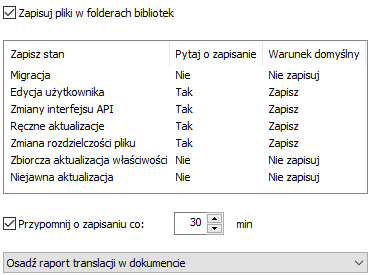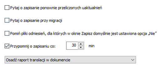 Monity Zapisz stan zastępują opcje Pytaj o zapisanie ponownie przeliczonych uaktualnień, Pytaj o zapisanie przy migracji i Pomiń pliki odniesień, dla których w oknie Zapisz domyślnie jest ustawiona opcja „Nie”.