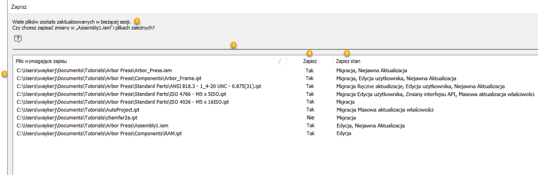 Okno dialogowe Zapisz w przypadku plików zależnych zostało udoskonalone, aby zapewnić dodatkowe informacje dotyczące stanu pliku (zespoły są niedostępne w programie Inventor LT).
