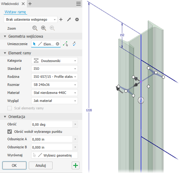 W przypadku polecenia Wstaw jest obecnie wyświetlany podgląd kształtu elementu i znacznik początku po wyróżnieniu geometrii szkicu. Po przesunięciu kursora wzdłuż szkicu umieszczenia można zmienić położenie początku i orientację profilu przed kliknięciem.