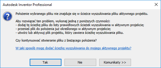 Komunikaty o błędach wyświetlane podczas próby otwarcia pliku, który nie znajduje się w ścieżce wyszukiwania aktywnego projektu, zostały zaktualizowane, aby zapewnić bardziej pomocne wyjaśnienie sposobu rozwiązania problemu: