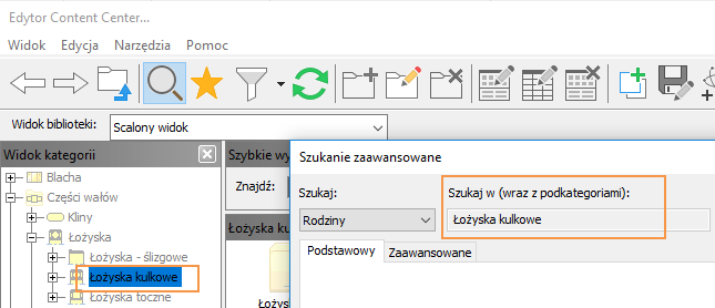 znajdujący się po prawej stronie pola wyszukiwania. Po usunięciu zaznaczenia pola wyszukiwania Edytor wróci do poprzednio wybranej kategorii w drzewie kategorii.
