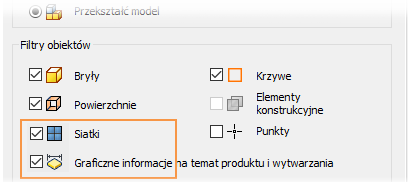 Obecnie można importować dane siatki programu SolidWorks. W sekcji Filtry obiektów okna dialogowego zaznacz opcję Siatki w celu uwzględnienia siatek w wybranym pliku. Aby uzyskać więcej informacji na temat pracy z danymi siatki, zobacz temat Praca z geometrią siatki — informacje.