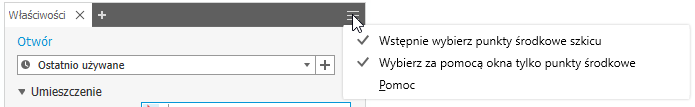 Polecenie Otwór zawiera nowe wpisy w menu panelu:
