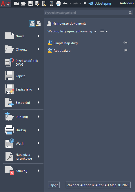 Menu aplikacji zawiera pole wyszukiwania oraz polecenia związane z plikami. Polecenie Opcje powoduje wyświetlenie okna dialogowego Opcje programu AutoCAD, w którym dostępne są ustawienia sterujące takimi parametrami, jak np. kolor tła map.