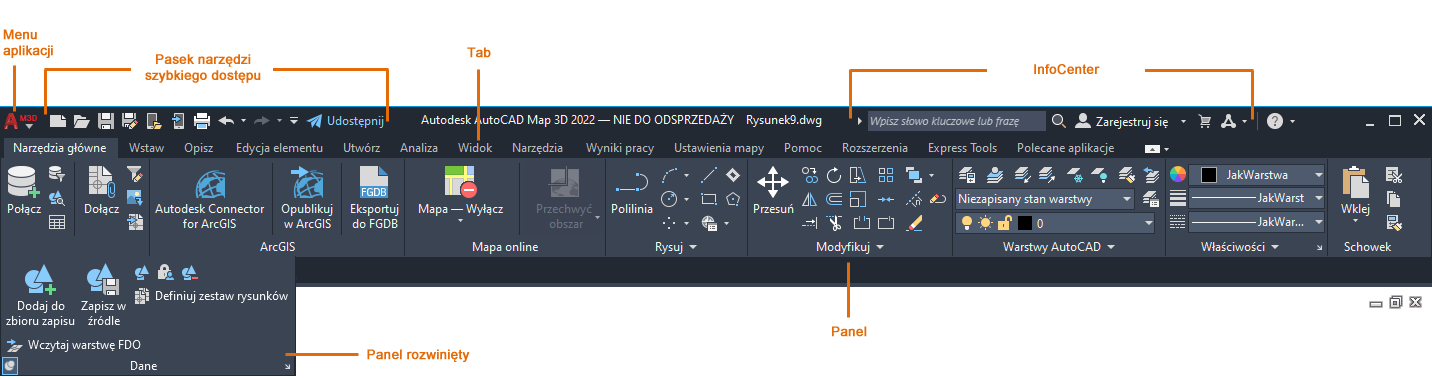 Karty widoczne w górnej części okna programu Zestaw narzędzi AutoCAD Map 3D nazywane są wstążką.