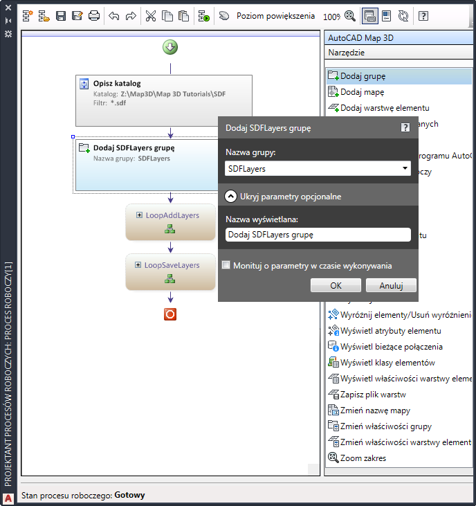 W ramach tej lekcji użytkownik zmieni wstępnie zdefiniowany proces roboczy, który tworzy warstwy Menedżera wyświetlania na podstawie folderu pełnego plików SDF i zapisuje je w plikach .layer. Zostanie utworzona grupa przeznaczona do przechowywania warstw, a następnie zostaną przeniesione do niej warstwy.
