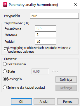Uwaga: Dostęp do tego okna dialogowego można uzyskać także przez zmianę typu istniejącej analizy dynamicznej na Analizę harmoniczną w dziedzinie częstotliwości (FRF).