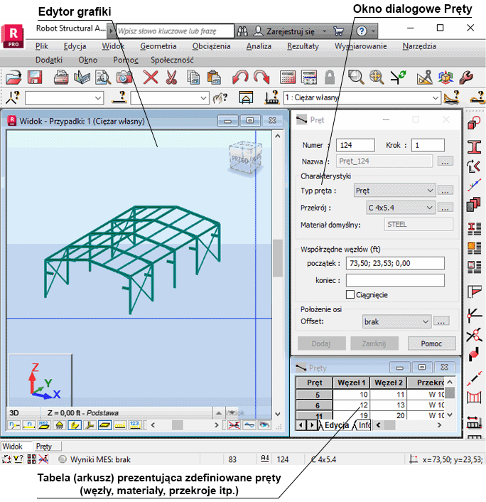 Okno dialogowe Pręt (w przypadku innego ekranu będzie to inne okno dialogowe) służące do definiowania kolejnych prętów konstrukcji Uwaga. W celu uzyskania lepszej czytelności na obrazie nie pokazano okna dialogowego Inspektora obiektów.