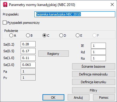 Aby przeprowadzić analizę sejsmiczną według zasad podanych w normie NBCC 2010, należy zdefiniować następujące parametry: