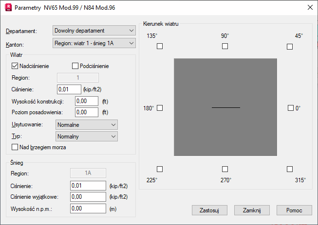Po kliknięciu opcji Parametry w oknie dialogowym Obciążenie śniegiem i wiatrem 3D wyświetlane są następujące informacje: