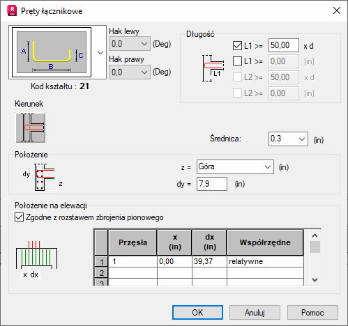 Uwaga: Zbrojenie łączące belkę ścianę z płytą nie jest generowane automatycznie, dlatego też w powyższym oknie dialogowym należy zdefiniować wszystkie parametry zbrojenia.