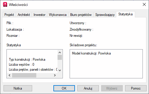 Po wyborze karty Statystyka w oknie dialogowym Właściwości pojawiają się opcje podające statystykę projektu. Okno dialogowe przybiera postać pokazaną na poniższym rysunku. W powyższym oknie prezentowane są następujące informacje o projekcie: nazwa pliku, kiedy został utworzony i zmodyfikowany, rozmiar pliku i gdzie się plik znajduje na dysku oraz statystyka konstrukcji i składowe projektu.
