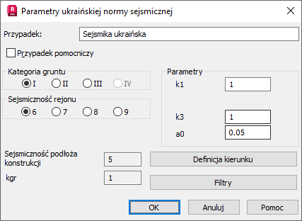 Parametry analizy sejsmicznej konstrukcji zależą od wyboru normy sejsmicznej, która będzie wykorzystywana podczas obliczeń konstrukcji poddanej wpływom obciążeń sejsmicznych. Po wyborze ukraińskiej normy sejsmicznej w oknie dialogowym Nowy przypadek lub naciśnięciu przycisku Parametry w oknie Typ analizy na ekranie pojawia się okno dialogowe pokazane poniżej.