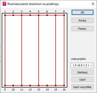 Aby zdefiniować kształt i rozmieszczenie zbrojenia poprzecznego, należy klikać w kolejne pręty podłużne; określony zostanie w ten sposób kształt zbrojenia poprzecznego. Wyznaczone kształty powinny być dla strzemion figurami zamkniętymi. Symbolem szpilki lub szekli jest odcinek prosty łączący dwa pręty podłużne. Kolejne definicje kształtu należy kończyć poprzez naciśnięcie przycisku Zastosuj.
