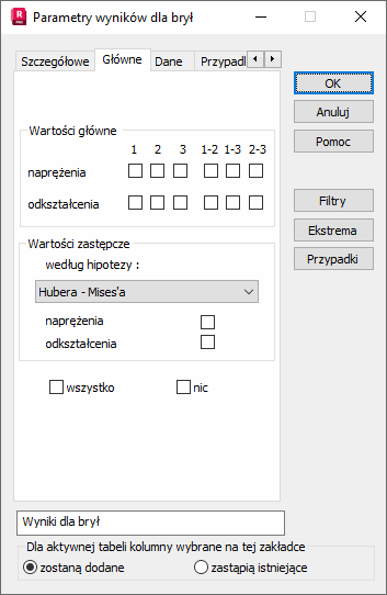 W powyższym oknie dialogowym wybrane mogą zostać do prezentacji naprężenia lub odkształcenia. Wartości zredukowane podawane są według wybranej hipotezy, które są dostępne na liście znajdującej się w dolnej części okna dialogowego. Obecnie dostępne są następujące hipotezy: