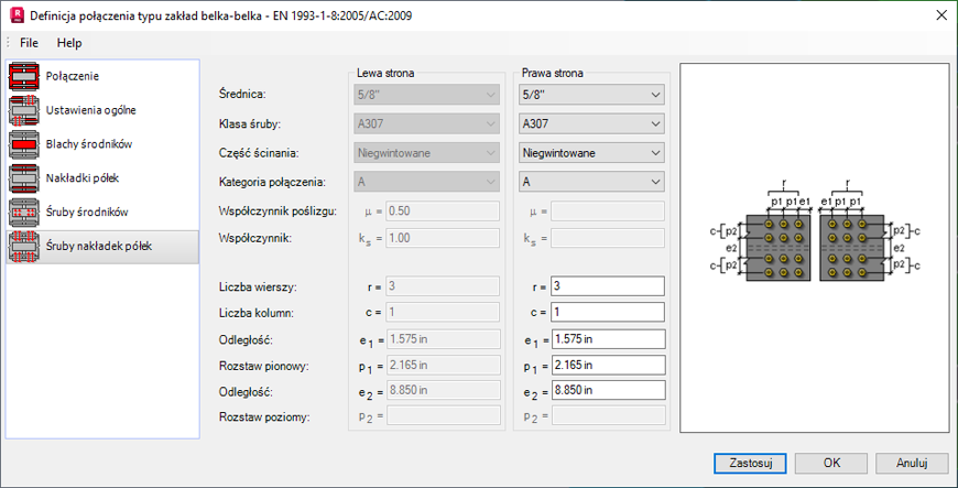 Użyj panelu śrub nakładki półki, aby określić parametry śrub łączących nakładkę z półkami pręta.