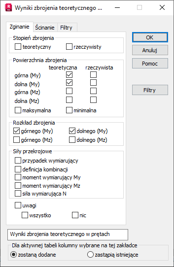 W powyższym oknie dialogowym wybrane mogą zostać następujące wielkości, które będą prezentowane w tabeli wyników zbrojenia teoretycznego (wymaganego) dla prętów konstrukcji: