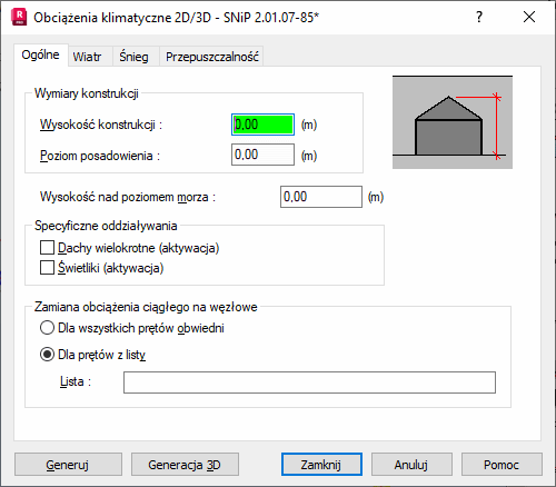 - Wysokość — umożliwia definiowanie wysokości konstrukcji; na podstawie tego wymiaru wyznaczane jest ciśnienie wiatru