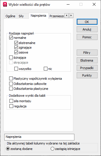 Aby zdefiniować wartości naprężeń dla celów prezentacji, należy wybrać kartę Naprężenia w oknie dialogowym Wybór wielkości dla prętów.
