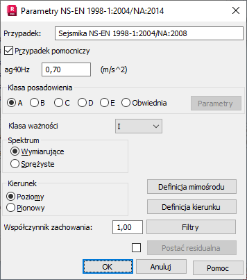 Parametry analizy sejsmicznej konstrukcji zależą od normy sejsmicznej, która będzie stosowana podczas obliczeń konstrukcji poddanej wpływom obciążeń sejsmicznych. Należy wybrać normę sejsmiczną NS—EN 1998—1:2004/NA:2008 w oknie dialogowym Nowy przypadek lub kliknąć przycisk Parametry w oknie dialogowym Typy analizy.