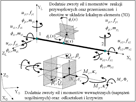 Mając dane odkształcenia uogólnione {ε 0x, k y , k x } przekroju, odkształcenie e xl lub jego przyrost De xl w dowolnym punkcie przekroju l o współrzędnych yl, zl, wyznaczany jest jako: